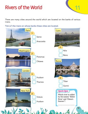 Rivers of the WorldThere are many cities around the world which are located on the banks of various rivers.Tick (%uf033) the rivers on whose banks these cities are located.11RomeCairoNew YorkLondonWashingtonParisSeineAnacostiaPotomacOttawaNileRenoTiberGomtiHudsonThamesVistulaHudson156234Which river is called by the names %u2018Yellow River%u2019 and %u2018China%u2019s Sorrow%u2019?...................................19