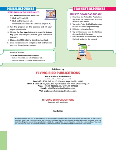 Note for Teacher:Visit www.flyingbirdpublications.com%u2022Click on Virtual CD and select Teacher tab.%u2022Fill in the number of Unique Keys you require.STEPS TO RUN THE VIRTUAL CD1.Visit www.flyingbirdpublications.comlClick on Virtual CDlClick on the Student tab%u0009 %u0009%u0009 DownloadandinstallthesoftwareonyourPC.2.%u0009 Runtheprogramonthedesktopandfillyourregistrationdetails.3.Click on the Add NewbuttonandentertheUnique Key (take the Unique Key from your concerned teacher).4.Click on the OKbuttontostartthedownload.5.Once the download is complete, click on the book and play the animated content.DIGITAL RESOURCESPublished byFLYING BIRD PUBLICATIONSEDUCATIONAL PUBLISHERSA subsidiary of Omen Publishing House Pvt. Ltd.Regd. Off. : 25/4, Gali No. 17, Vishwas Nagar, Delhi-110032Admn. & Sales Off. :3/1/10,Site-IV,SahibabadIndl.Area,Ghaziabad(U.P)Phone : (0120) 4152032, 33, 4279122, 4279828E-mail :info@flyingbirdpublications.comVisit us at :www.flyingbirdpublications.com%u00a9 FLYING BIRD PUBLICATIONSReserved with publishersNew EditionAllrightsreserved.Nopartofthisworkmaybereproducedorutilizedinanyformorbyanymeans,electronicormechanical,includingphotocopy,recording,orbyanyinformationstorageandretrievalsystemwithoutpermissioninwritingfromthepublisher.Enquiriesconcerningreproductionoutsidethescopeoftheaboveshouldbesenttotheaddressabove.Youmustnotcirculatethisbookinanyotherbindingorcoverandyoumustimposethissameconditiononanyacquirer.`345.00Printedat:ShriBalajiPrintersSTEPS TO DOWNLOAD THE APP1.%u0009 DownloadtheFlyingBirdPublicationsappfromtheGooglePlayStoreandinstall on your phone.2.%u0009 TapontheFlyingBirdPublicationsiconto open the Home page of the app.3.%u0009 Fillintheregistrationform.4.Tap on Library and scan the QR Code given on back of the cover. 5.Once the book is downloaded, tap on theBookandenjoythecontent.TEACHER'S RESOURCES