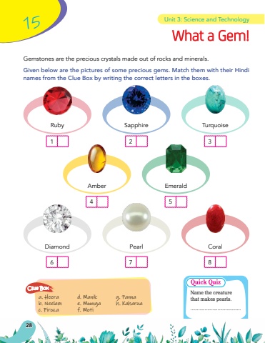 What a Gem!EmeraldDiamondSapphireRubyAmberTurquoise Pearl CoralUnit 3: Science and Technology15Gemstones are the precious crystals made out of rocks and minerals.Given below are the pictures of some precious gems. Match them with their Hindi names from the Clue Box by writing the correct letters in the boxes.a. Heerab. Neelam c. Firoza d. Manike. Moonga f. Moti g. Panna h. KaharuaClue Box16274538Name the creature that makes pearls........................................28