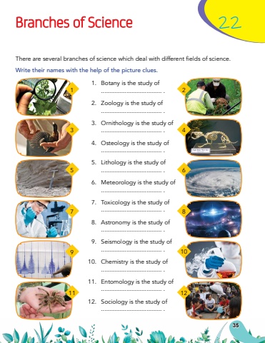 Branches of Science22There are several branches of science which deal with different fields of science. Write their names with the help of the picture clues.1.Botany is the study of .................................... .2.Zoology is the study of .................................... .3.Ornithology is the study of .................................... .4.Osteology is the study of .................................... .5.Lithology is the study of .................................... .6.Meteorology is the study of .................................... .7.Toxicology is the study of .................................... .8.Astronomy is the study of .................................... .9.Seismology is the study of .................................... .10.Chemistry is the study of .................................... .11.Entomology is the study of .................................... .12.Sociology is the study of .................................... .13579112468101235