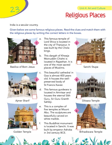 Religious Placesa.This famous temple of Lord Shiva is located in the city of Thanjavur. It was built by the Chola kings.b.This dargah of Khwaja Moinuddin Chishti is located in Rajasthan. It is one of the most sacred places of Muslims.c.This beautiful cathedral in Goa is almost 400 years old. It houses the wellpreserved body of St Francis Xavier.d.This famous gurdwara is located in Amritsar and houses the eternal Sikh Guru, Sri Guru Granth Sahibji.e.This is a complex of five temples at Mount Abu. The sculptures are beautifully carved on white marble.f.This Buddhist monument is located in Sanchi. It was built by emperor Ashoka in 3rd century BCE.23Unit 4: Art and CultureIndia is a secular country.Given below are some famous religious places. Read the clues and match them with the religious places by writing the correct letters in the boxes.Basilica of Bom JesusAjmer SharifGolden Temple Sanchi StupaDilwara TempleBrihadisvara Temple13524638