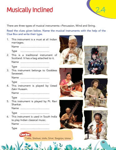 Musically Inclined24There are three types of musical instruments%u2014Percussion, Wind and String.Read the clues given below. Name the musical instruments with the help of the Clue Box and write their type.1.This instrument is a must at all Indian marriages.Name.......................................Type.......................................2.This is a traditional instrument of Scotland. It has a bag attached to it.Name.......................................Type.......................................3.This instrument belongs to Goddess Saraswati.Name.......................................Type.......................................4.This instrument is played by Ustad Zakir Hussain.Name.......................................Type.......................................5.This instrument is played by Pt. Ravi Shankar.Name.......................................Type.......................................6.This instrument is used in South India to play Indian classical music.Name.......................................Type.......................................Tabla, Shehnai, Violin, Sitar, Bagpipe, VeenaClue Box39