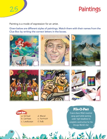 25PaintingsPainting is a mode of expression for an artist.Given below are different styles of paintings. Match them with their names from the Clue Box by writing the correct letters in the boxes.a. Virtualb. Cartoonc. Landscaped. Murale. Portraitf. FolkClue BoxFrancis Davis Millet invented spray paint while working under tight deadlines to complete construction for the Chicago World%u2019s Fair.File-O-Fact14253640