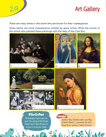 Art GalleryThere are many artists in the world who are known for their masterpieces.Given below are some masterpieces created by great artists. Write the names of the artists who painted these paintings with the help of the Clue Box. Jamini Roy, Rembrandt van Rijn, Claude Monet, Leonardo da Vinci, Raja Ravi Varma, Pablo PicassoClue BoxMichelangelo took 4 years to paint the ceiling of the Sistine Chapel, but it took 20 years to restore it in the late 1900s.File-O-Fact4. ..........................5. ..........................6. ..................................291. ...................................2. ..........................3. ..........................44