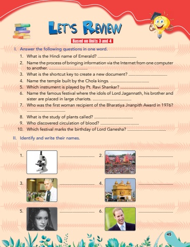 I.Answer the following questions in one word.1.What is the Hindi name of Emerald? ................................2.Name the process of bringing information via the Internet from one computer to another. ................................3.What is the shortcut key to create a new document? ................................4.Name the temple built by the Chola kings. ................................5.Which instrument is played by Pt. Ravi Shankar? ................................6.Name the famous festival where the idols of Lord Jagannath, his brother and sister are placed in large chariots. ................................7.Who was the first woman recipient of the Bharatiya Jnanpith Award in 1976? ................................8.What is the study of plants called? ................................9.Who discovered circulation of blood? ................................10.Which festival marks the birthday of Lord Ganesha? ................................II.Identify and write their names.1..............................2..............................3..............................4..............................5..............................6..............................Based on Units 3 and 445