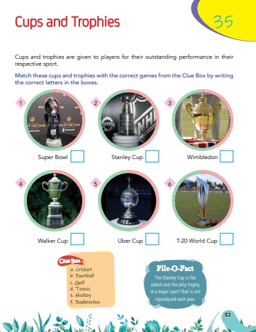 Cups and Trophiesa. Cricketb. Footballc. Golfd. Tennise. Hockeyf. BadmintonClue BoxThe Stanley Cup is the oldest and the only trophy in a major sport that is not reproduced each year.File-O-FactCups and trophies are given to players for their outstanding performance in their respective sport.Match these cups and trophies with the correct games from the Clue Box by writing the correct letters in the boxes.Super BowlStanley Cup WimbledonWalker Cup Uber Cup T-20 World Cup3514253653