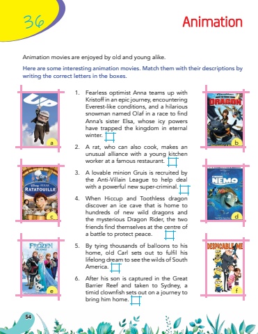 36Animation1.Fearless optimist Anna teams up with Kristoff in an epic journey, encountering Everest-like conditions, and a hilarious snowman named Olaf in a race to find Anna%u2019s sister Elsa, whose icy powers have trapped the kingdom in eternal winter.2.A rat, who can also cook, makes an unusual alliance with a young kitchen worker at a famous restaurant.3.A lovable minion Gruis is recruited by the Anti-Villain League to help deal with a powerful new super-criminal. 4.When Hiccup and Toothless dragon discover an ice cave that is home to hundreds of new wild dragons and the mysterious Dragon Rider, the two friends find themselves at the centre of a battle to protect peace. 5.By tying thousands of balloons to his home, old Carl sets out to fulfil his lifelong dream to see the wilds of South America. 6.After his son is captured in the Great Barrier Reef and taken to Sydney, a timid clownfish sets out on a journey to bring him home. Animation movies are enjoyed by old and young alike.Here are some interesting animation movies. Match them with their descriptions by writing the correct letters in the boxes.acebdf54