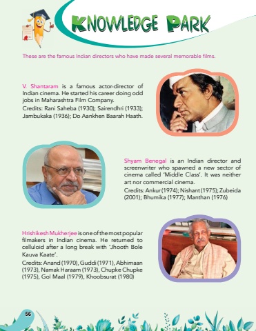 These are the famous Indian directors who have made several memorable films.V. Shantaram is a famous actor-director of Indian cinema. He started his career doing odd jobs in Maharashtra Film Company.Credits: Rani Saheba (1930); Sairendhri (1933); Jambukaka (1936); Do Aankhen Baarah Haath.Shyam Benegal is an Indian director and screenwriter who spawned a new sector of cinema called %u2018Middle Class%u2019. It was neither art nor commercial cinema.Credits: Ankur (1974); Nishant (1975); Zubeida (2001); Bhumika (1977); Manthan (1976)Hrishikesh Mukherjee is one of the most popular filmakers in Indian cinema. He returned to celluloid after a long break with %u2018Jhooth Bole Kauva Kaate%u2019.Credits: Anand (1970), Guddi (1971), Abhimaan (1973), Namak Haraam (1973), Chupke Chupke (1975), Gol Maal (1979), Khoobsurat (1980)56