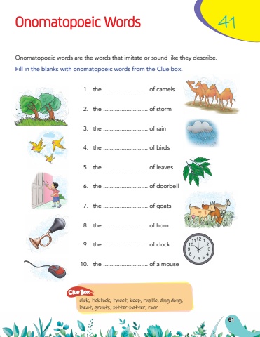 Onomatopoeic Words411.the ........................... of camels2.the ........................... of storm3.the ........................... of rain4.the ........................... of birds5.the ........................... of leaves6.the ........................... of doorbell7.the ........................... of goats8.the ........................... of horn9.the ........................... of clock10.the ........................... of a mouseOnomatopoeic words are the words that imitate or sound like they describe.Fill in the blanks with onomatopoeic words from the Clue box.click, ticktock, tweet, beep, rustle, ding dong, bleat, grunts, pitter-patter, roarClue Box61