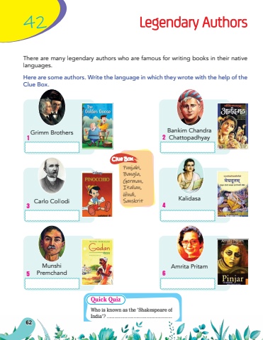 Legendary AuthorsGrimm BrothersBankim Chandra ChattopadhyayThere are many legendary authors who are famous for writing books in their native languages.Here are some authors. Write the language in which they wrote with the help of the Clue Box. 42Punjabi, Bangla, German, Italian, Hindi, SanskritClue Box12Carlo CollodiKalidasa34Munshi PremchandAmrita Pritam56Who is known as the %u2018Shakespeare of India%u2019? ...................................................62