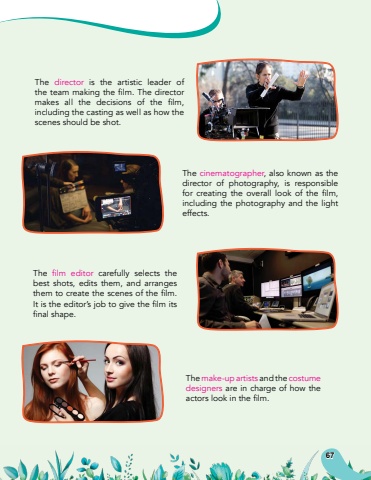 The make-upartists and the costume designers are in charge of how the actors look in the film. The cinematographer, also known as the director of photography, is responsible for creating the overall look of the film, including the photography and the light effects. The director is the artistic leader of the team making the film. The director makes all the decisions of the film, including the casting as well as how the scenes should be shot. The film editor carefully selects the best shots, edits them, and arranges them to create the scenes of the film. It is the editor%u2019s job to give the film its final shape.67