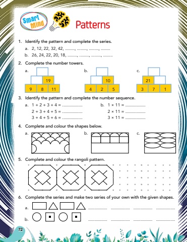 SmartMindPatterns1.Identify the pattern and complete the series.a.2, 12, 22, 32, 42, ........, ........, ........, ........b.26, 24, 22, 20, 18, ........, ........, ........, ........2.Complete the number towers.a.b.c.3.Identify the pattern and complete the number sequence.a.1 + 2 + 3 + 4 = .................b.1 %u00d7 11 = .................2 + 3 + 4 + 5 = .................2 %u00d7 11 = .................3 + 4 + 5 + 6 = .................3 %u00d7 11 = .................4.Complete and colour the shapes below.a.b.c.5.Complete and colour the rangoli pattern.6.Complete the series and make two series of your own with the given shapes.a................. ................ ................ ................b................. ................ ................ ................981119425103712172