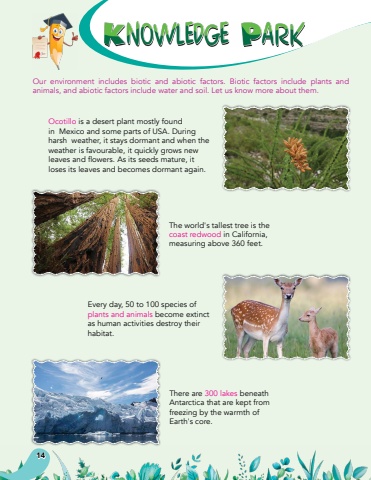 The world's tallest tree is the coast redwood in California, measuring above 360 feet.Every day, 50 to 100 species of plants and animals become extinct as human activities destroy their habitat.There are 300 lakes beneath Antarctica that are kept from freezing by the warmth of Earth's core.Ocotillo is a desert plant mostly found in Mexico and some parts of USA. During harsh weather, it stays dormant and when the weather is favourable, it quickly grows new leaves and flowers. As its seeds mature, it loses its leaves and becomes dormant again.Our environment includes biotic and abiotic factors. Biotic factors include plants and animals, and abiotic factors include water and soil. Let us know more about them.14