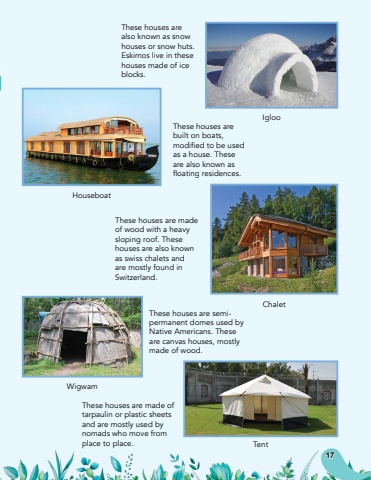 These houses are also known as snow houses or snow huts. Eskimos live in these houses made of ice blocks.IglooHouseboatThese houses are built on boats, modified to be used as a house. These are also known as floating residences.ChaletThese houses are made of wood with a heavy sloping roof. These houses are also known as swiss chalets and are mostly found in Switzerland.WigwamThese houses are semipermanent domes used by Native Americans. These are canvas houses, mostly made of wood.TentThese houses are made of tarpaulin or plastic sheets and are mostly used by nomads who move from place to place.17