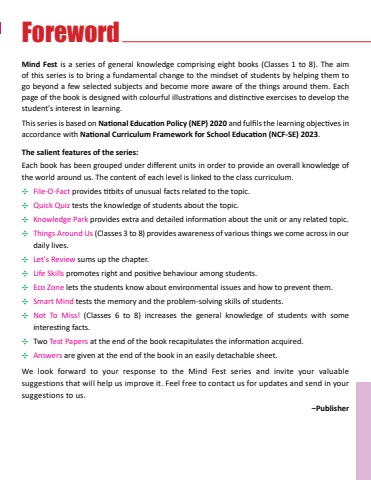 ForewordMind Fest is a series of general knowledge comprising eight books (Classes 1 to 8).The aim of this series is to bring a fundamental change to the mindset of students by helping them to gobeyondafewselectedsubjectsandbecomemoreawareofthethingsaroundthem.Eachpageofthebookisdesignedwithcolourfulillustrationsanddistinctiveexercisestodevelopthestudent's interest in learning.This series is based on National Education Policy (NEP) 2020andfulfilsthelearningobjectivesinaccordance with National Curriculum Framework for School Education (NCF-SE) 2023.The salient features of the series:Eachbookhasbeengroupedunderdifferentunitsinordertoprovideanoverallknowledgeofthe world around us. The content of each level is linked to the class curriculum.CFile-O-Factprovidestitbitsofunusualfactsrelatedtothetopic.CQuick Quiz tests the knowledge of students about the topic.CKnowledgeParkprovidesextraanddetailedinformationabouttheunitoranyrelatedtopic.CThings Around Us (Classes 3 to 8) provides awareness of various things we come across in our daily lives.CLet's Review sums up the chapter.CLife Skillspromotesrightandpositivebehaviouramongstudents.CEco Zone lets the students know about environmental issues and how to prevent them.CSmart Mind tests the memory and the problem-solving skills of students.CNot To Miss! (Classes 6 to 8) increases the general knowledge of students with someinterestingfacts.CTwo TestPapersattheendofthebookrecapitulatestheinformationacquired.CAnswers are given at the end of the book in an easily detachable sheet. We look forward to your response to the Mind Fest series and invite your valuable suggestions that will help us improve it. Feel free to contact us for updates and send in your suggestions to us.%u2013Publisher