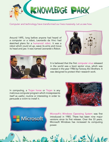 Computer and technology have transformed our lives massively. Let us see how.Around 1495, long before anyone had heard of a computer or a robot, Leonardo da Vinci had sketched plans for a humanoid robot. It was a robot which could sit up, wave its arms and move its head and jaw. It was named Leonardo's Robot.It is believed that the first computer virus released in the world was a boot sector virus, which was created in the year 1986 by Farooq Alvi Brothers. It was designed to protect their research work.In computing, a Trojan horse or Trojan is any malicious computer program which misrepresents itself as useful, routine or interesting in order to persuade a victim to install it.Microsoft's Windows Operating System was first introduced in 1985. There has been nine major versions since its first release. Over the 33 years, Microsoft Windows has increased its computing power.38