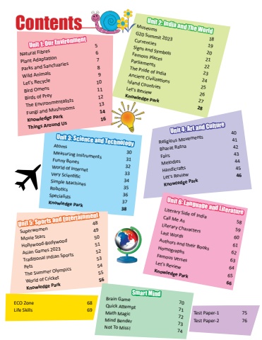 ContentsNatural Fibres5PlantAdaptation%u00096ParksandSanctuaries%u00097Wild Animals8Let's Recycle9BirdOmens%u000910BirdsofPrey%u000911The Environmentalists12Fungi and Mushrooms13Knowledge Park14Things Around Us16Unit 1: Our EnvironmentMuseums18G20 Summit 202319Currencies20Signs and Symbols21FamousPlaces%u000922Parliaments%u000923ThePrideofIndia%u000924AncientCivilizations%u000925Island Countries26Let's Review27Knowledge Park28Unit 2: India and The WorldAtomsMeasuring Ins30trumentsFunn31yBones%u0009World of In32ternetVery33Scientific%u0009Simple Machines34Robotics%u000935Specialis36tsKnowledg37e Park38Unit 3: Science and TechnologySuperwomen48Movie Stars49Hollywood-Bollywood%u000950Asian Games 202351TraditionalIndianSports%u000952Pets%u000953The Summer Olympics54World of Cricket55Knowledge Park56Unit 5: Sports and EntertainmentUnit 5: Sports and EntertainmentLiterary Side of India58Call Me As59Literary Characters60Last Words61AuthorsandtheirBooks%u000962Homographs63Famous Verses64Let's Review65Knowledge Park66Unit 6: Language and LiteratureReligious Movements40BharatRatna%u000941Fairs42Melodies43Handicrafts%u000944Let's Review45Knowledge Park46Unit 4: Art and CultureUnit 4: Art and CultureBrainGame%u000970QuickAttempt%u000971Math Magic72MindBender%u000973Not To Miss!74Smart MindECO Zone68Life Skills69TestPaper-1%u0009 75TestPaper-2%u0009 76