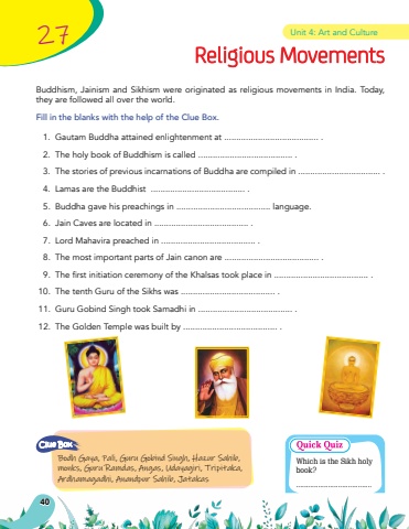 Buddhism, Jainism and Sikhism were originated as religious movements in India. Today, they are followed all over the world. Fill in the blanks with the help of the Clue Box.1.Gautam Buddha attained enlightenment at ....................................... . 2.The holy book of Buddhism is called ....................................... .3.The stories of previous incarnations of Buddha are compiled in .................................. .4.Lamas are the Buddhist ....................................... . 5.Buddha gave his preachings in ....................................... language. 6.Jain Caves are located in ....................................... .7.Lord Mahavira preached in ....................................... .8.The most important parts of Jain canon are ....................................... .9.The first initiation ceremony of the Khalsas took place in ....................................... .10.The tenth Guru of the Sikhs was ....................................... .11.Guru Gobind Singh took Samadhi in ....................................... .12. The Golden Temple was built by ....................................... .Religious Movements27Bodh Gaya, Pali, Guru Gobind Singh, Hazur Sahib, monks, Guru Ramdas, Angas, Udayagiri, Tripitaka, Ardhamagadhi, Anandpur Sahib, JatakasClue BoxUnit 4: Art and CultureWhich is the Sikh holy book?......................................40