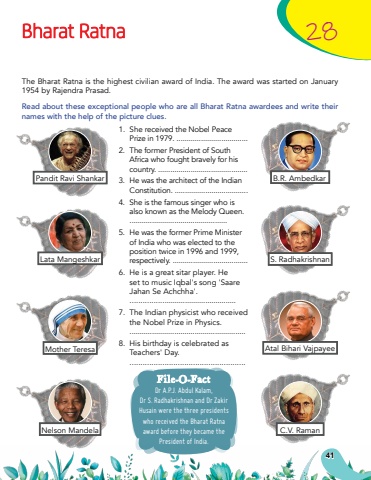 Bharat Ratna1.She received the Nobel Peace Prize in 1979. ...................................2.The former President of South Africa who fought bravely for his country. ............................................3.He was the architect of the Indian Constitution. ....................................4.She is the famous singer who is also known as the Melody Queen. ................................................5.He was the former Prime Minister of India who was elected to the position twice in 1996 and 1999, respectively. .....................................6.He is a great sitar player. He set to music Iqbal's song 'Saare Jahan Se Achchha'. ...................................................7.The Indian physicist who received the Nobel Prize in Physics. .........................................................8.His birthday is celebrated as Teachers' Day. .....................................................28Pandit Ravi ShankarLata MangeshkarS. RadhakrishnanMother TeresaAtal Bihari VajpayeeNelson MandelaB.R. AmbedkarC.V. RamanDr A.P.J. Abdul Kalam, Dr S. Radhakrishnan and Dr Zakir Husain were the three presidents who received the Bharat Ratna award before they became the President of India.File-O-FactThe Bharat Ratna is the highest civilian award of India. The award was started on January 1954 by Rajendra Prasad.Read about these exceptional people who are all Bharat Ratna awardees and write their names with the help of the picture clues.41
