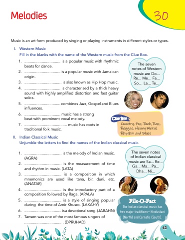 MelodiesMusic is an art form produced by singing or playing instruments in different styles or types.I.Western MusicFill in the blanks with the name of the Western music from the Clue Box. The seven notes of Western music are Do... Re... Me... Fa... So%u2026 La... Te...The seven notes of Indian classical music are Sa... Re... Ga... Ma... Pa... Dha... Ni...30II.Indian Classical MusicUnjumble the letters to find the names of the Indian classical music. Country, Pop, Rock, Rap, Reggae, Heavy Metal, Rhythm and BluesClue BoxThe Indian classical music has two major traditions%u2013 Hindustani (North) and Carnatic (South).File-O-Fact1.................................. is a popular music with rhythmic beats for dance.2.................................. is a popular music with Jamaican origin. 3................................... is also known as Hip Hop music. 4.................................. is characterised by a thick heavy sound with highly amplified distortion and fast guitar solos.5.................................. combines Jazz, Gospel and Blues influences.6.................................. music has a strong beat with prominent vocal melody.7........................................ music has roots in traditional folk music.1................................... is the melody of Indian music. (AGRA)2................................... is the measurement of time and rhythm in music. (LATA)3................................... is a composition in which mnemonics are used like tana, bir, duni, etc. (ANATAR) 4................................... is the introductory part of a composition followed by Raga. (APALA)5................................... is a style of singing popular during the time of Amir Khusro. (LAKAHY)6................................... is a devotional song. (JABAHN)7.Tansen was one of the most famous singers of.................................. . (DPRUHAD)43