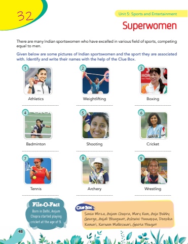 32SuperwomenThere are many Indian sportswomen who have excelled in various field of sports, competing equal to men.Given below are some pictures of Indian sportswomen and the sport they are associated with. Identify and write their names with the help of the Clue Box. 123AthleticsWeightliftingBoxing...................................................................................................456BadmintonShootingCricket...................................................................................................789TennisArcheryWrestling...................................................................................................Sania Mirza, Anjum Chopra, Mary Kom, Anju Bobby George, Anjali Bhagwat, Ashwini Ponnappa, Deepika Kumari, Karnam Malleswari, Geeta PhogatClue BoxBorn in Delhi, Anjum Chopra started playing cricket at the age of 9.File-O-FactUnit 5: Sports and Entertainment48