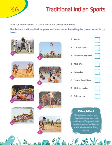 Traditional Indian SportsIndia has many traditional sports which are famous worldwide.Match these traditional Indian sports with their names by writing the correct letters in the boxes.1.Kushti2.Camel Race 3.Bullock Cart Race 4.Kho kho5.Kabaddi6.Snake Boat Race7.Mallakhamba8.Gillidanda36Gillidanda is an amateur sport played in the rural areas and small towns of Bangladesh, India, Nepal, Afghanistan and Pakistan as well as in Cambodia, Turkey and Italy.File-O-Factabdfhceg52