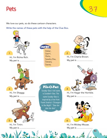 Scooby-Doo's full name is Scoobert-Doo. The name Scooby-Doo is inspired by a line from Frank Sinatra's 'Strangers in the Night': ''Doo-bedoo-be-doo''.File-O-FactPetsWe love our pets, so do these cartoon characters. Write the names of these pets with the help of the Clue Box.Hi, I%u2019m Richie Rich.My pet is.........................Hi, I%u2019m Shaggy.My pet is.........................Hi, I%u2019m Tintin.My pet is .........................Hi, I%u2019m Mickey Mouse.My pet is.........................Hi, I%u2019m Hagar the Horrible.My pet is.........................Hi, I%u2019m Charlie Brown.My pet is.........................37Dollar,Snert, Pluto, Scooby-Doo, Snoopy, SnowyClue Box13524653