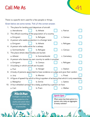 There is a specific term used for a few people or things. Given below are some names. Tick (3) the correct answer. 1.The place for landing and departure of aircraft.a. Aerodromeb. Atheistc. Patriot2.The official counting of the population of a country.a. Emigrantb. Refugeec. Census3.A person who seeks protection in a foreign land.a. Emigrantb. Atheistc. Refugee4.A person who walks while he is asleep.a. Somnambulistb. Refugeec. Census5.The place where dead bodies are buried.a. Atheistb. Somnambulistc. Cemetery6.A person who leaves his own country to settle in another.a. Emigrantb. Censusc. Refugee7.A building in which aircraft are housed.a. Portb. Hangerc. Station8.A body of persons appointed to hear evidence or judge and give their verdict.a. Juryb. Mentorc. Priest9.A figure of speech by which a thing is spoken of as being that which it only resembles.a. Metaphorb. Similec. Sattire10.A four-wheeled carriage for a baby, pushed by a person on foot.a. Cartb. Pramc. WalkerA refugee is a person who lives outside his or her country and cannot return due to an identifiable fear of persecution.File-O-FactCall Me As41What name has been given to a person who rules an aggregate of many nations?.....................................................59