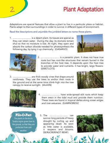 The plants in the Arctic Tundra region grow close to the ground, so that they are protected from cold weather.File-O-FactAdaptations are special features that allow a plant to live in a particular place or habitat. Plants adapt to their surroundings in order to survive in different types of environment. Read the descriptions and unjumble the jumbled letters to name these plants.1............................. is a desert plant. Its tissues are special as they can retain water. During the day, its stomata remain shut so that no moisture is lost. At night, they open and absorb the carbon dioxide needed for photosynthesis the following day, by tying it up chemically. (GASARUO)2............................. is a parasitic plant. It does not have true roots but has root-like structures that remain buried in the branches of the host tree. It depends upon the host tree to provide water and nutrients. It has bright, large flowers. (SIMETLOTE)3............................. are thick woody vines that drape around rainforests. They use the trees to anchor their roots in the ground and at the same time climb high into the tree canopy to receive sunlight. (IALASN)4............................. have wide-spread stilt roots which keep them erect in the tidal mud and provide them nutrition. These trees are found in tropical deltas along ocean edges and river estuaries. (GAMNORESV)5.The ............................ can survive long periods of heavy drought by curling up and appearing dead. As soon as little water is available, it reopens and blooms. (SERUCRERINOT RENF)2Plant Adaptation6