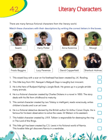 42Literary CharactersThere are many famous fictional characters from the literary world.Match these characters with their descriptions by writing the correct letters in the boxes.1.This wizard boy with a scar on his forehead has been created by J.K. Rowling. 2.This little boy from R.K. Narayan's Malgudi Days is naughty but innocent. 3.He is the hero of Rudyard Kipling's Jungle Book. He grows up in a jungle amidst many animals. 4.He is a fictional character created by Charles Dickens in a novel in 1850. The story deals with his life from childhood to maturity. 5.This central character created by Leo Tolstoy is intelligent, reads voraciously, writes children's books and is an art lover.6.He is a fictional detective devised by the British author Sir Arthur Conan Doyle. He is famous for his keen observation to solve the cases. Dr Watson is his assistant. 7.This hobbit character created by J.R.R. Tolkien is responsible for destroying the ring in The Lord of the Rings.8.This little girl has been created by C.S. Lewis in his fictional world of Narnia. This lovable little girl discovers Narnia in a wardrobe.aSwamieFrodo BagginsfLucy PevensiegDavid CopperfieldhSherlock HolmesbHarry PottercAnna KareninadMowgli60
