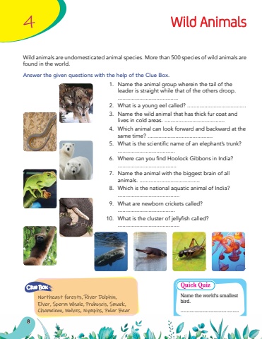 4Wild AnimalsWild animals are undomesticated animal species. More than 500 species of wild animals are found in the world. Answer the given questions with the help of the Clue Box.1.Name the animal group wherein the tail of the leader is straight while that of the others droop. .......................................2.What is a young eel called? ......................................3.Name the wild animal that has thick fur coat and lives in cold areas. .......................................4.Which animal can look forward and backward at the same time? ..........................................5.What is the scientific name of an elephant%u2019s trunk? .....................................6.Where can you find Hoolock Gibbons in India? ......................................7.Name the animal with the biggest brain of all animals. .......................................8.Which is the national aquatic animal of India? ........................................9.What are newborn crickets called? .....................................10.What is the cluster of jellyfish called? ........................................Northeast forests, River Dolphin, Elver, Sperm Whale, Proboscis, Smack, Chameleon, Wolves, Nymphs, Polar BearClue BoxName the world's smallest bird...............................................8
