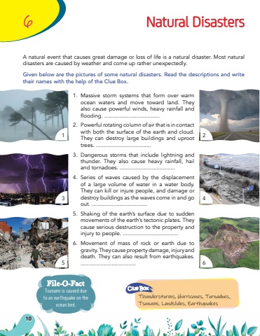 106A natural event that causes great damage or loss of life is a natural disaster. Most natural disasters are caused by weather and come up rather unexpectedly.Given below are the pictures of some natural disasters. Read the descriptions and write their names with the help of the Clue Box.Natural DisastersTsunami is caused due to an earthquake on the ocean bed.File-O-FactThunderstorms, Hurricanes, Tornadoes, Tsunami, Landslides, EarthquakesClue Box1.Massive storm systems that form over warm ocean waters and move toward land. They also cause powerful winds, heavy rainfall and flooding.....................................2.Powerful rotating column of air that is in contact with both the surface of the earth and cloud. They can destroy large buildings and uproot trees. ....................................3.Dangerous storms that include lightning and thunder. They also cause heavy rainfall, hail and tornadoes. ....................................4.Series of waves caused by the displacement of a large volume of water in a water body. They can kill or injure people, and damage or destroy buildings as the waves come in and go out. ....................................5.Shaking of the earth%u2019s surface due to sudden movements of the earth%u2019s tectonic plates. They cause serious destruction to the property and injury to people. ....................................6.Movement of mass of rock or earth due to gravity. They cause property damage, injury and death. They can also result from earthquakes. ....................................246135
