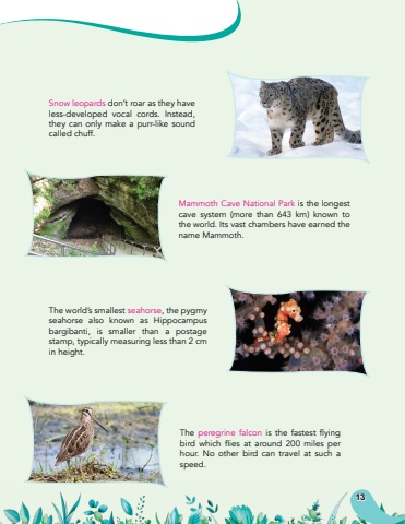 13Snow leopards don%u2019t roar as they have less-developed vocal cords. Instead, they can only make a purr-like sound called chuff.Mammoth Cave National Park is the longest cave system (more than 643 km) known to the world. Its vast chambers have earned the name Mammoth.The world%u2019s smallest seahorse, the pygmy seahorse also known as Hippocampus bargibanti, is smaller than a postage stamp, typically measuring less than 2 cm in height.The peregrine falconisthefastestflyingbirdwhichfliesataround200milesperhour. No other bird can travel at such a speed.