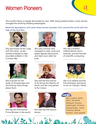 1714725836Women Pioneers9The world%u2019s history is largely dominated by men. With strong determination, some women changed the world by breaking stereotypes.Read the descriptions and name these women pioneers from around the world with the help of the Clue Box.Shewasthefirstwomandoctor....................................She was a brilliant mathematician and a scientist, and the founder ofscientificcomputing....................................She is an athlete and the firstAustralianaboriginalto win an Olympic medal....................................She was a woman who managed to read, write and speak despite being blind and deaf, soon after her birth....................................ShewasthefirstwomantoflyacrosstheAtlanticallalone, and the only person toflyittwice....................................She was known as the %u2018Lady with the Lamp%u2019, as she worked tirelessly to help wounded soldiers in the Crimean War....................................Ada Lovelace, Helen Keller, Elizabeth Blackwell, Florence Nightingale, Sirimavo Bandaranaike, Cathy Freeman, Amelia Earhart, Jane GoodallClue BoxShewasthefirstwomanPrime Minister in the world....................................She is known for her study of chimpanzees and discovering many things about them....................................