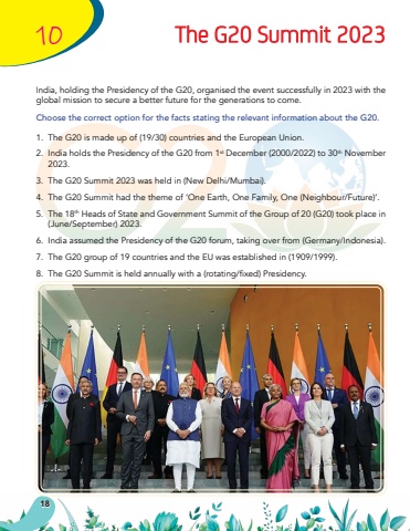 1810The G20 Summit 2023India, holding the Presidency of the G20, organised the event successfully in 2023 with the global mission to secure a better future for the generations to come.Choose the correct option for the facts stating the relevant information about the G20.1.The G20 is made up of (19/30) countries and the European Union.2.India holds the Presidency of the G20 from 1st December (2000/2022) to 30th November 2023.3.The G20 Summit 2023 was held in (New Delhi/Mumbai).4.The G20 Summit had the theme of %u2018One Earth, One Family, One (Neighbour/Future)%u2019.5.The 18th Heads of State and Government Summit of the Group of 20 (G20) took place in (June/September) 2023.6.India assumed the Presidency of the G20 forum, taking over from (Germany/Indonesia).7.The G20 group of 19 countries and the EU was established in (1909/1999).8.%u0009 TheG20Summitisheldannuallywitha(rotating/fixed)Presidency.