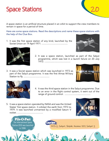 3120Aspacestationisanartificialstructureplacedinanorbittosupportthecrewmemberstoremain in space for a period of time.Here are some space stations. Read the descriptions and name these space stations with the help of the Clue Box.Space StationsDOS-2, Salyut, Skylab, Kosmos 557, Salyut 2The International Space Clue BoxStation (ISS) was launched in 1998.File-O-Fact1.%u0009 Itwasthefirstspacestationofanykind,launchedbytheSoviet Union on 19 April 1971. ........................................2.It was a space station, launched as part of the Salyut programme, which was lost in a launch failure on 20 July 1972. ........................................3.It was a Soviet space station which was launched in 1973 as partoftheSalyutprogramme.ItwasthefirstAlmazMilitaryStationtofly.........................................4.It was the third space station in the Salyut programme. Due toanerrorintheflightcontrolsystem,itwentoutoftherange of ground control. ........................................5.It was a space station operated by NASA and was the United States%u2019firstspacestation.Itorbitedtheearthfrom1973to1979.ItwaslaunchedunmannedbyamodifiedSaturnVrocket. ........................................