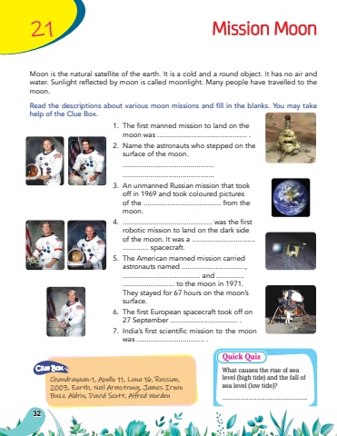 3221Mission MoonMoon is the natural satellite of the earth. It is a cold and a round object. It has no air and water.Sunlightreflectedbymooniscalledmoonlight.Manypeoplehavetravelledtothemoon. Read the descriptions about various moon missions and fill in the blanks. You may take help of the Clue Box.Chandrayaan-1, Apollo 11, Luna 16, Russian, 2003, Earth, Neil Armstrong, James Irwin Buzz Aldrin, David Scott, Alfred WordenClue BoxWhat causes the rise of sea level (high tide) and the fall of sea level (low tide)?....................................................1.%u0009 Thefirstmannedmissiontolandonthemoon was ............................................. .2.Name the astronauts who stepped on the surface of the moon. ............................................................................................3.An unmanned Russian mission that took off in 1969 and took coloured pictures of the ....................................... from the moon. 4.%u0009 .............................................wasthefirstrobotic mission to land on the dark side of the moon. It was a ............................................. spacecraft. 5.The American manned mission carried astronauts named ................................, ....................................... and ........................................ to the moon in 1971. They stayed for 67 hours on the moon%u2019s surface.6.%u0009 ThefirstEuropeanspacecrafttookoffon27 September .................................. .7.%u0009 India%u2019sfirstscientificmissiontothemoonwas .................................. .