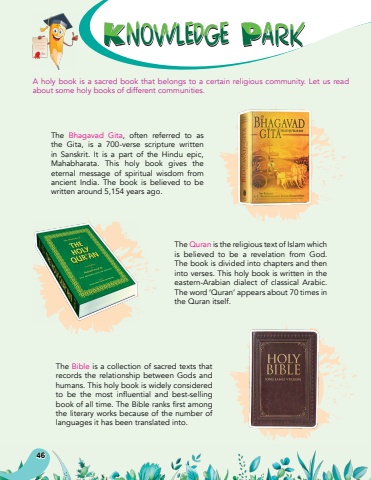 46A holy book is a sacred book that belongs to a certain religious community. Let us read about some holy books of different communities.The Bhagavad Gita, often referred to as the Gita, is a 700-verse scripture written in Sanskrit. It is a part of the Hindu epic, Mahabharata. This holy book gives the eternal message of spiritual wisdom from ancient India. The book is believed to be written around 5,154 years ago.The Quran is the religious text of Islam which is believed to be a revelation from God. The book is divided into chapters and then into verses. This holy book is written in the eastern-Arabian dialect of classical Arabic. The word %u2018Quran%u2019 appears about 70 times in the Quran itself.The Bible is a collection of sacred texts that records the relationship between Gods and humans. This holy book is widely considered tobethemostinfluentialandbest-sellingbookofalltime.TheBibleranksfirstamongthe literary works because of the number of languages it has been translated into.
