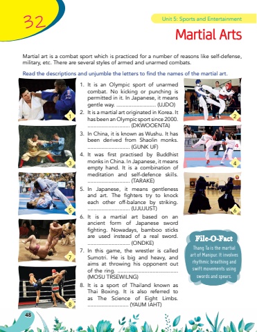 4832Martial art is a combat sport which is practiced for a number of reasons like self-defense, military, etc. There are several styles of armed and unarmed combats.Read the descriptions and unjumble the letters to find the names of the martial art.1.It is an Olympic sport of unarmed combat. No kicking or punching is permitted in it. In Japanese, it means gentle way. .......................... (UJDO)2.It is a martial art originated in Korea. It has been an Olympic sport since 2000. ............................ (DKWOOENTA)3.In China, it is known as Wushu. It has been derived from Shaolin monks. ............................ (GUNK UF)4.%u0009 ItwasfirstpractisedbyBuddhistmonks in China. In Japanese, it means empty hand. It is a combination of meditation and self-defence skills. ............................ (TARAKE)5.In Japanese, it means gentleness andart.Thefighterstrytoknockeach other off-balance by striking. ............................ (UJUJUST)6.It is a martial art based on an ancient form of Japanese sword fighting.Nowadays,bamboosticksare used instead of a real sword. ............................ (ONDKE)7.In this game, the wrestler is called Sumotri. He is big and heavy, and aims at throwing his opponent out of the ring. ........................................ (MOSU TRSEWILNG)8.It is a sport of Thailand known as Thai Boxing. It is also referred to as The Science of Eight Limbs. ........................... (YAUM IAHT)Thang Ta is the martial art of Manipur. It involves rhythmic breathing and swift movements using swords and spears.File-O-FactMartial ArtsUnit 5: Sports and Entertainment13578246