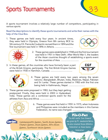 4933A sports tournament involves a relatively large number of competitors, participating in various sports.Read the descriptions to identify these sports tournaments and write their names with the help of the Clue Box.Sports Tournaments1.These games are held every four years. In ancient times, they were held in Olympia, Greece from 8th century BCE to 5th century CE. Pierre de Coubertin revived them in 1894 and the firsttournamentwasheldin1896inAthens.............................2.%u0009Thesegameswereestablishedin1948andthefirsttournamentwas held in 1951 in New Delhi. After World War II, the leaders of the Asian countries thought of establishing a sports event for the countries of Asia. ............................3. In these games, all the countries who have formerly been a part oftheBritishEmpire,participate.ThefirstBritishEmpireGameswere held in 1930 in Hamilton, Canada. ..................................4. These games are held every two years among the seven nations%u2014Bangladesh, Bhutan, India, Maldives, Nepal, Pakistan andSriLanka.Thesegamesstartedin1983withthefirstonebeing held in Kathmandu, Nepal. .........................5. These games were proposed in 1983, but they kept getting postponed. Finally, they were held in 2003 in Hyderabad, India. These games are a combined sports event for the athletes from Asia and Africa. ....................6.%u0009 Thesegameswerefirstheldin1959.In1975,whenIndonesiaand Philippines were included as the members in this Games Federation, its name was changed. ......................................The AGF motto %u2018Ever Onward%u2019 was given by Pt. Jawaharlal Nehru. He also renamed %u2018Asian Athletics Federation%u2019 as %u2018Asian Games Federation%u2019.File-O-FactCommonwealth Games, South Asian Games, Olympic Games, Asian Games, Afro-Asian Games, Southeast Asian GamesClue Box