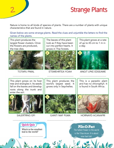 62Strange PlantsNature is home to all kinds of species of plants. There are a number of plants with unique characteristics that are found in nature.Given below are some strange plants. Read the clues and unjumble the letters to find the names of the plants.TOTAPLI PMAL.......................................SALERTRNG GFI .......................................ETSWEHRTEA YOAH.......................................GANTI NAF PLMA.......................................ANGIT LPKE EDSEAWE.......................................HORNAYD ACANAFRI.......................................The tallest flower in the world is the Titan Arum. It is about nine feet tall.File-O-FactThis plant produces the largestflowerclusters.Oncetheflowersareproduced,the tree dies.This plant grows on its host tree and strangles it. Its seeds fall on the leaves and develop roots along the trunk and enter the soil.The leaves of this plant look as if they have been cut into perfect hearts. It grows in Thai forests. This plant produces the world%u2019s largest seed. It grows only in Seychelles.This plant grows at a rate of up to 45 cm to 1 m in a day. This is a parasitic plant and has no chlorophyll. It is found in South Africa.142536Which is the smallest leaf in the world?......................................