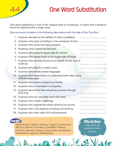 6244One Word SubstitutionOne word substitution is one of the integral parts of vocabulary. It means that a sentence has to be replaced with a single word.Give one word suitable to the following description with the help of the Clue Box.%u0009 1.%u0009 Apersondevotedtothewelfareofothersunselfishly.........................................2.A person who does not believe in the existence of God.........................................3.A person who cannot be easily pleased.........................................4.Anything which cannot be believed.........................................5.A person who supports equal right for women.........................................6.A person who always looks at the bright side of things.........................................7.A person who devotes his service or wealth for the love of mankind.........................................8.A person who dies for a noble cause.........................................9.A person who knows several languages.........................................10.A person who helps others to understand each other using different languages.........................................11.A person who learns a subject as a hobby.........................................12.A person who is interested in antiquities.........................................13.A person who thinks that everything is known through God only.........................................14.A person who can use either hand with ease.........................................15.A person who is bad in spellings.........................................16.A person who regards the whole world as his country.........................................17.A person who is for pleasure of eating and drinking.........................................18.A person who often talks of his achievements.........................................Philanthropist, Egotist, Martyr, Linguist, Interpreter, Altruist, Atheist, Fastidious, Incredible, Feminist, Optimist, Amateur, Epicure, Cacographer, Antiquarian, Cosmopolitan, Agnostic, AmbitextrousClue BoxA man with an evil reputation is called a notorious.File-O-Fact