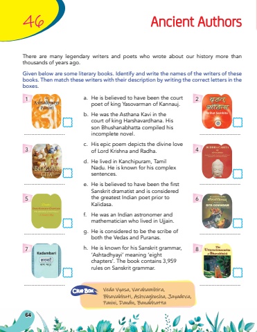 6446There are many legendary writers and poets who wrote about our history more than thousands of years ago.Given below are some literary books. Identify and write the names of the writers of these books. Then match these writers with their description by writing the correct letters in the boxes.......................................................Ancient Authorsa.He is believed to have been the court poet of king Yasovarman of Kannauj.b.He was the Asthana Kavi in the court of king Harshavardhana. His son Bhushanabhatta compiled his incomplete novel.c.His epic poem depicts the divine love of Lord Krishna and Radha.d.He lived in Kanchipuram, Tamil Nadu. He is known for his complex sentences.e.%u0009 HeisbelievedtohavebeenthefirstSanskrit dramatist and is considered the greatest Indian poet prior to Kalidasa.f.He was an Indian astronomer and mathematician who lived in Ujjain.g.He is considered to be the scribe of both the Vedas and Puranas.h.He is known for his Sanskrit grammar, %u2018Ashtadhyayi%u2019 meaning %u2018eight chapters%u2019. The book contains 3,959 rules on Sanskrit grammar.Veda Vyasa, Varahamihira, Bhavabhuti, Ashvaghosha, Jayadeva, Panini, Dandin, BanabhattaClue Box12........................... ...........................34........................... ...........................56........................... ...........................78