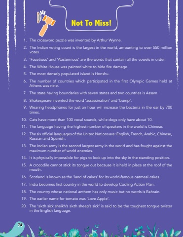 741.The crossword puzzle was invented by Arthur Wynne.2.The Indian voting count is the largest in the world, amounting to over 550 million votes.3.%u2018Facetious%u2019 and %u2018Abstemious%u2019 are the words that contain all the vowels in order.%u0009 4.%u0009 TheWhiteHousewaspaintedwhitetohidefiredamage.5.The most densely populated island is Honshu.%u0009 6.%u0009 ThenumberofcountrieswhichparticipatedinthefirstOlympicGamesheldatAthens was nine.7.The state having boundaries with seven states and two countries is Assam.8.Shakespeare invented the word %u2018assassination%u2019 and %u2018bump%u2019.9.Wearing headphones for just an hour will increase the bacteria in the ear by 700 times.10.Cats have more than 100 vocal sounds, while dogs only have about 10.11.The language having the highest number of speakers in the world is Chinese.%u0009 12.%u0009 ThesixofficiallanguagesoftheUnitedNationsare:English,French,Arabic,Chinese,Russian and Spanish.13.The Indian army is the second largest army in the world and has fought against the maximum number of world enemies.14.It is physically impossible for pigs to look up into the sky in the standing position.15.A crocodile cannot stick its tongue out because it is held in place at the roof of the mouth.16.Scotland is known as the %u2018land of cakes%u2019 for its world-famous oatmeal cakes.%u0009 17.%u0009 IndiabecomesfirstcountryintheworldtodevelopCoolingActionPlan.18.The country whose national anthem has only music but no words is Bahrain. 19.The earlier name for tomato was %u2018Love Apple%u2019.20.The %u2018sixth sick sheikh%u2019s sixth sheep%u2019s sick%u2019 is said to be the toughest tongue twister in the English language.Not To Miss!