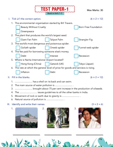 75Based on Units 1-3I.Tick (3) the correct option.(6 %u00d7 2 = 12)1.The environmental organisation started by Bill Travers.Beauty Without CrueltyBorn Free FoundationGreenpeace2.The plant that produces the world%u2019s largest seed.Giant Fan PalmTalipot PalmStrangler Fig3.The world%u2019s most dangerous and poisonous spider.Goliath spiderOrweb spiderFunnel-web spider4.The fee paid for borrowing someone else%u2019s money.DebtInterestRecession5.Where is Narita International Airport located?Hong Kong (China)Gatwick (UK)Tokyo (Japan)6.The rate at which the general level of price for goods and serviecs is rising.%u0009Inflation%u0009DebtRecessionII.Fill in the blanks.(6 %u00d7 2 = 12)1........................... has a shell on its back and can swim.2.The main source of water pollution is .......................... .3........................... brought about 75 per cent increase in the production of oilseeds.4.The .......................... issues guidelines to all the other banks in India.5.Movement of rock or earth due to gravity is .......................... .6.Natural source of pollution is .......................... .III.Identify and write their names.(3 %u00d7 2 = 6)1.2.3.TEST PAPER-1Max Marks: 30
