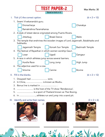 76Based on Units 4-6I.Tick (3) the correct option.(6 %u00d7 2 = 12)1.Swami Vivekananda%u2019s guru.DronacharyaChanakyaRamakrishna Paramahansa2.A style of street dance originated among Puerto Ricans.JitterbugBreak DanceWaltz3.The temple that enshrines the wooden images of Lord Jagannath, Balabhadra and Subhadra.Jagannath TempleKonark Sun TempleBadrinath Temple4.The festival of Rajasthan in which women worship Gauri.LosarUgadiGangaur5.A race in which athletes jump across several barriers.Hurdle RaceLong JumpHigh Jump6.The adjective used for a cow.SclurineCanineBovineII.Fill in the blanks.(6 %u00d7 2 = 12)1.Draupadi had .......................... sons.2.In China, .......................... is known as Wushu.3.Bonus line is marked in .......................... .4........................... is the host of the TV show %u2018Rendezvous%u2019.5........................... is a sport of Thailand known as Thai Boxing.6.In .........................., athletes run and jump into a sand pit.III.Identify and write their names.(3 %u00d7 2 = 6)1.2.3.TEST PAPER-2Max Marks: 30