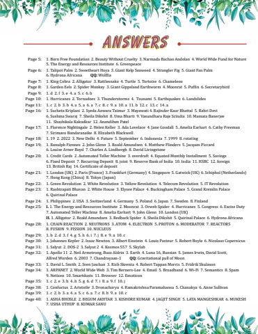 Page 5:1. Born Free Foundation 2. Beauty Without Cruelty 3. Narmada Bachao Andolan 4. World Wide Fund for Nature 5. The Energy and Resources Institute 6. GreenpeacePage 6:1. Talipot Palm 2. Sweetheart Hoya 3. Giant Kelp Seaweed 4. Strangler Fig 5. Giant Fan Palm 6. Hydrona Africana%u2003%u2003QQ: WolffiaPage 7:1. King Cobra 2. Alligator 3. Rattlesnake 4. Turtle 5. Tortoise 6. ChameleonPage 8:1. Garden Eels 2. Spider Monkey 3. Giant Gippsland Earthworm 4. Moonrat 5. Puffin 6. SecretarybirdPage 9:1. d 2. f 3. e 4. a 5. c 6. bPage 10:1. Hurricanes 2. Tornadoes 3. Thunderstorms 4. Tsunami 5. Earthquakes 6. LandslidesPage 11:1. c 2. b 3. b 4. a 5. a 6. a 7. c 8. c 9. a 10. a 11. b 12. c 13. c 14. aPage 16:1. Sucheta Kriplani 2. Syeda Anwara Taimur 3. Mayawati 4. Rajinder Kaur Bhattal 5. Rabri Devi 6. Sushma Swaraj 7. Sheila Dikshit 8. Uma Bharti 9. Vasundhara Raje Scindia 10. Mamata Banerjee 11. Shashikala Kakodkar 12. Anandiben PatelPage 17:1. Florence Nightingale 2. Helen Keller 3. Ada Lovelace 4. Jane Goodall 5. Amelia Earhart 6. Cathy Freeman 7. Sirimavo Bandaranaike 8. Elizabeth BlackwellPage 18:1. 19 2. 2022 3. New Delhi 4. Future 5. September 6. Indonesia 7. 1999 8. rotatingPage 19:1. Ranulph Fiennes 2. John Glenn 3. Roald Amundsen 4. Matthew Flinders 5. Jacques Piccard 6. Louise Arner Boyd 7. Charles A. Lindbergh 8. David LivingstonePage 20:1. Credit Cards 2. Automated Teller Machine 3. overdraft 4. Equated Monthly Installment 5. Savings 6. Fixed Deposit 7. Recurring Deposit 8. joint 9. Reserve Bank of India 10. India 11. HSBC 12. foreign 13. British Raj 14. Certificate of depositPage 21:1. London (UK) 2. Paris (France) 3. Frankfurt (Germany) 4. Singapore 5. Gatwick (UK) 6. Schiphol (Netherlands) 7. Hong Kong (China) 8. Tokyo (Japan)Page 22:1. Green Revolution 2. White Revolution 3. Yellow Revolution 4. Telecom Revolution 5. IT RevolutionPage 23:1. Rashtrapati Bhavan 2. White House 3. Elysee Palace 4. Buckingham Palace 5. Grand Kremlin Palace 6. Quirinal PalacePage 24:1. Philippines 2. USA 3. Switzerland 4. Germany 5. Poland 6. Japan 7. Sweden 8. FinlandPage 25:I. 1. The Energy and Resources Institute 2. Moonrat 3. Orweb Spider 4. Hurricanes 5. Congress 6. Excise Duty 7. Automated Teller Machine 8. Amelia Earhart 9. John Glenn 10. London (UK)II. 1. Alligator 2. Roald Amundsen 3. Redback Spider 4. Sheila Dikshit 5. Quirinal Palace 6. Hydrona AfricanaPage 28:1. CHAIN REACTION 2. NEUTRONS 3. ATOM 4. ELECTRON 5. PROTON 6. MODERATOR 7. REACTORS 8. FUSION 9. FISSION 10. NUCLEUSPage 29:1. b 2. d 3. f 4. g 5. h 6. i 7. j 8. e 9. a 10. cPage 30:1. Johannes Kepler 2. Isaac Newton 3. Albert Einstein 4. Louis Pasteur 5. Robert Boyle 6. Nicolaus CopernicusPage 31:1. Salyut 2. DOS-2 3. Salyut 2 4. Kosmos 557 5. SkylabPage 32:1. Apollo 11 2. Neil Armstrong, Buzz Aldrin 3. Earth 4. Luna 16, Russian 5. James Irwin, David Scott, Alfred Worden 6. 2003 7. Chandrayaan-1%u2003%u2003QQ: Gravitational pull of MoonPage 33:1. David L. Smith 2. Sven Jaschan 3. Rich Skrenta 4. Robert Tappan Morris 5. Fridrik SkulasonPage 34:1. ARPANET 2. World Wide Web 3. Tim Berners-Lee 4. Email 5. Broadband 6. Wi-Fi 7. Semantics 8. Spam 9. Netizen 10. Smartdusts 11. Browser 12. EmoticonPage 35:1. c 2. e 3. b 4. h 5. g 6. d 7. i 8. a 9. f 10. jPage 38:1. Confucius 2. Aristotle 3. Dronacharya 4. Ramakrishna Paramahansa 5. Chanakya 6. Anne SullivanPage 39:1. c 2. b 3. a 4. a 5. c 6. a 7. c 8. b 9. a 10. cPage 40:1. ASHA BHOSLE 2. BEGUM AKHTAR 3. KISHORE KUMAR 4. JAGJIT SINGH 5. LATA MANGESHKAR 6. MUKESH7. USHA UTHUP 8. KUMAR SANUAnswersAnswers