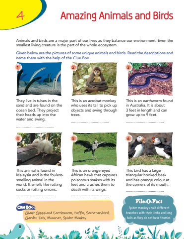 84Amazing Animals and BirdsAnimals and birds are a major part of our lives as they balance our environment. Even the smallest living creature is the part of the whole ecosystem.Given below are the pictures of some unique animals and birds. Read the descriptions and name them with the help of the Clue Box.Giant Gippsland Earthworm, Puffin, Secretarybird, Garden Eels, Moonrat, Spider MonkeyClue BoxSpider monkeys hold different branches with their limbs and long tails as they do not have thumbs.File-O-FactThey live in tubes in the sand and are found on the ocean bed. They project their heads up into the water and swing....................................This animal is found in Malaysia and is the foulestsmelling animal in the world. It smells like rotting socks or rotting onions....................................This is an acrobat monkey who uses its tail to pick up objects and swing through trees....................................This is an orange-eyed African hawk that captures poisonous snakes with its feet and crushes them to death with its wings....................................This is an earthworm found in Australia. It is about 3 feet in length and can grow up to 9 feet....................................This bird has a large triangular hooked beak and has orange colour at the corners of its mouth....................................142536