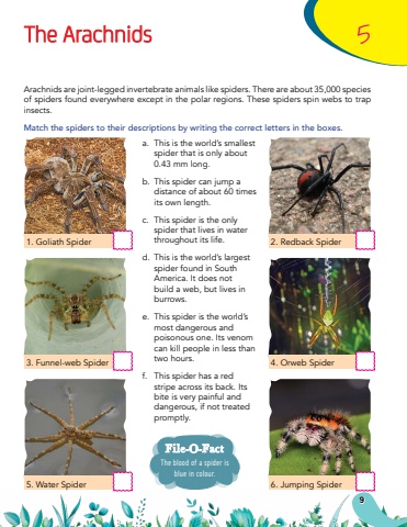 9The Arachnids5Arachnids are joint-legged invertebrate animals like spiders. There are about 35,000 species of spiders found everywhere except in the polar regions. These spiders spin webs to trap insects.Match the spiders to their descriptions by writing the correct letters in the boxes.a.This is the world%u2019s smallest spider that is only about 0.43 mm long.b.This spider can jump a distance of about 60 times its own length.c.This spider is the only spider that lives in water throughout its life.d.This is the world%u2019s largest spider found in South America. It does not build a web, but lives in burrows.e.This spider is the world%u2019s most dangerous and poisonous one. Its venom can kill people in less than two hours.f.This spider has a red stripe across its back. Its bite is very painful and dangerous, if not treated promptly.The blood of a spider is blue in colour.File-O-Fact5. Water Spider6. Jumping Spider3. Funnel-web Spider4. Orweb Spider1. Goliath Spider2. Redback Spider