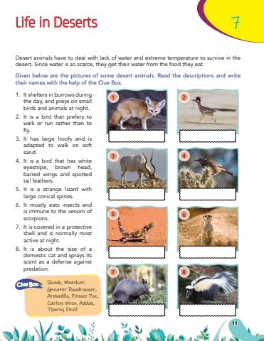 11Life in Deserts7Skunk, Meerkat, Greater Roadrunner, Armadillo, Fennec Fox, Cactus Wren, Addax, Thorny DevilClue BoxDesert animals have to deal with lack of water and extreme temperature to survive in the desert. Since water is so scarce, they get their water from the food they eat.Given below are the pictures of some desert animals. Read the descriptions and write their names with the help of the Clue Box.1.It shelters in burrows during the day, and preys on small birds and animals at night. 2.It is a bird that prefers to walk or run rather than to fly.3.It has large hoofs and is adapted to walk on soft sand.4.It is a bird that has white eyestripe, brown head, barred wings and spotted tail feathers.5.It is a strange lizard with large conical spines.6.It mostly eats insects and is immune to the venom of scorpions.7.It is covered in a protective shell and is normally most active at night.8.It is about the size of a domestic cat and sprays its scent as a defense against predation.12783456